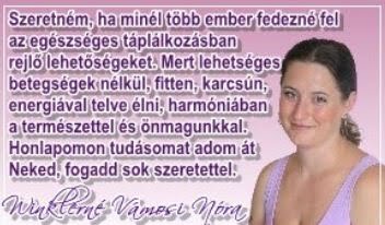 V: Mit is üzenhetnék!? Hogy szakítsanak fokozatosan egészségtelen táplálkozásukkal, és vegyék észre, hogy testük egy csoda. Nem szabad mérgező és semmit nem érő anyagokkal telepakolni. Változtassanak még ma valamin, holnap pedig ismét tegyenek egy újabb lépést az egészség felé. A táplálkozáson túl pedig mozogjanak sokat és örömmel, mint a gyermekek. Próbáljanak harmóniában élni saját magukkal és embertársaikkal. Gondolkodjanak mindig pozitívan és érezzenek hálát jelenlegi egészségükért és mindenért, amijük van. A szeretet érzése pedig minden élethelyzetben legyen velük, mert bár a táplálkozás nagyon sokat jelent egészségünk megőrzése érdekében, de ha nincs szeretet, ha stressz, harag, düh, frusztráció tölti be életünket, az ugyanúgy beárnyékolhatja egészségünket.